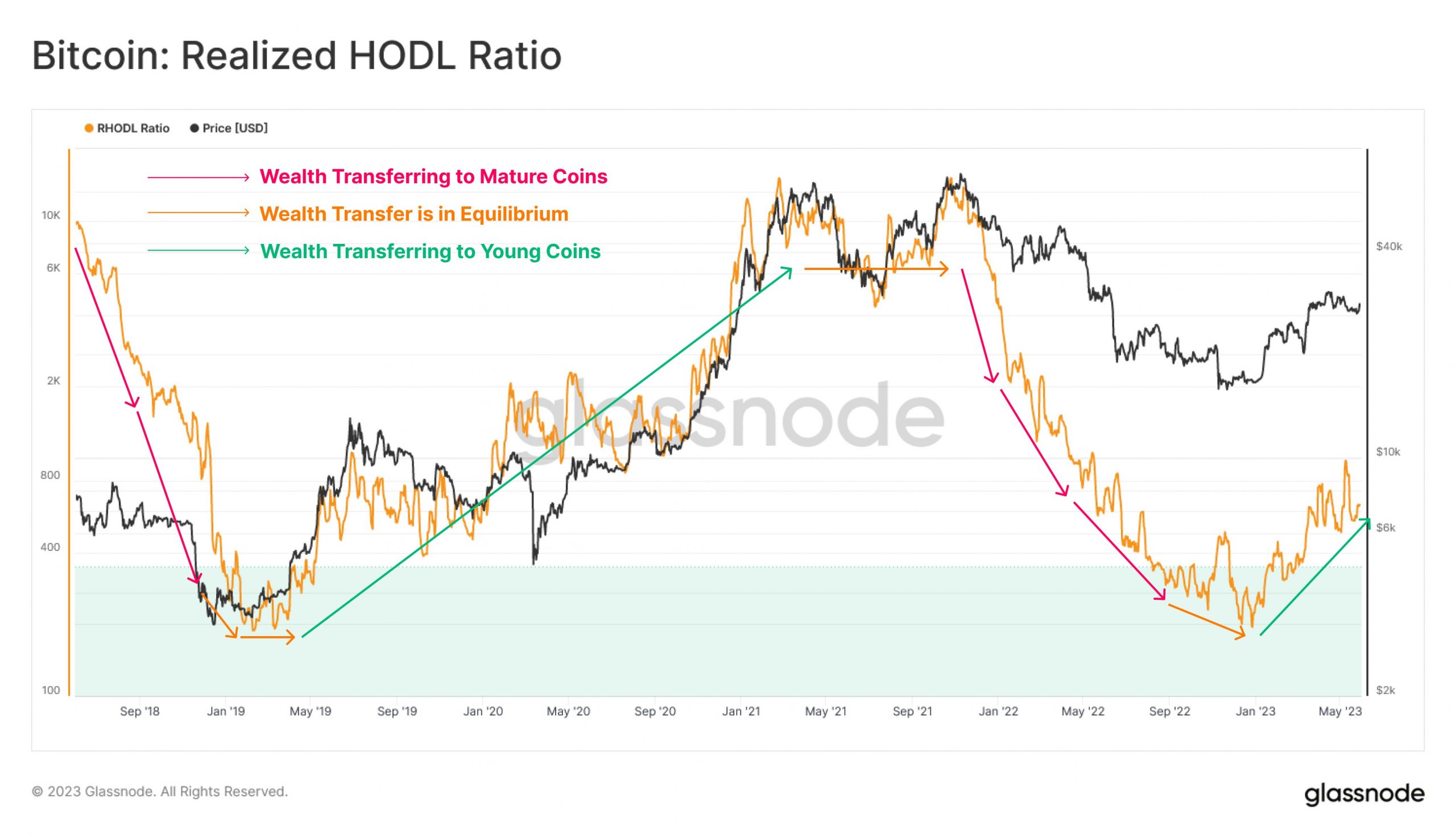 According to data from the on-chain analytics firm Glassnode, this kind of trend is usually seen in the middle of cycle transitions. The “Realized HODL (RHODL) ratio” is an indicator that tells us the ratio between the supplies held by the 1-week-old holders and the 1 to 2 years old investors.