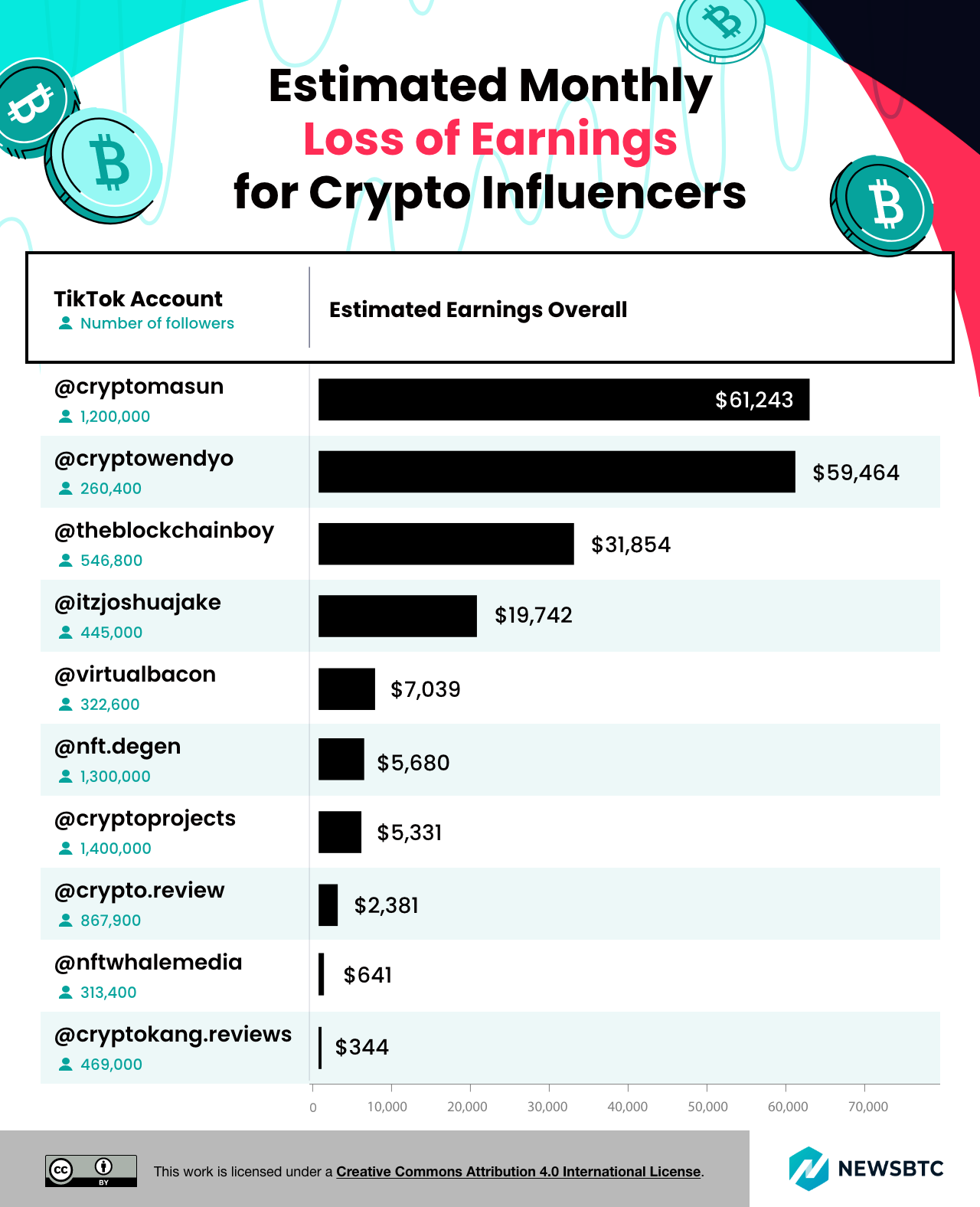 NewsBTC analyzed the biggest Finance and Crypto influencers on TikTok to find out what their potential monthly loss of earnings could be if TikTok is banned in the U.S.A. A list of the top 50 influencers was collated by merging a list of ‘best crypto currency influencers’ from the top Google results.