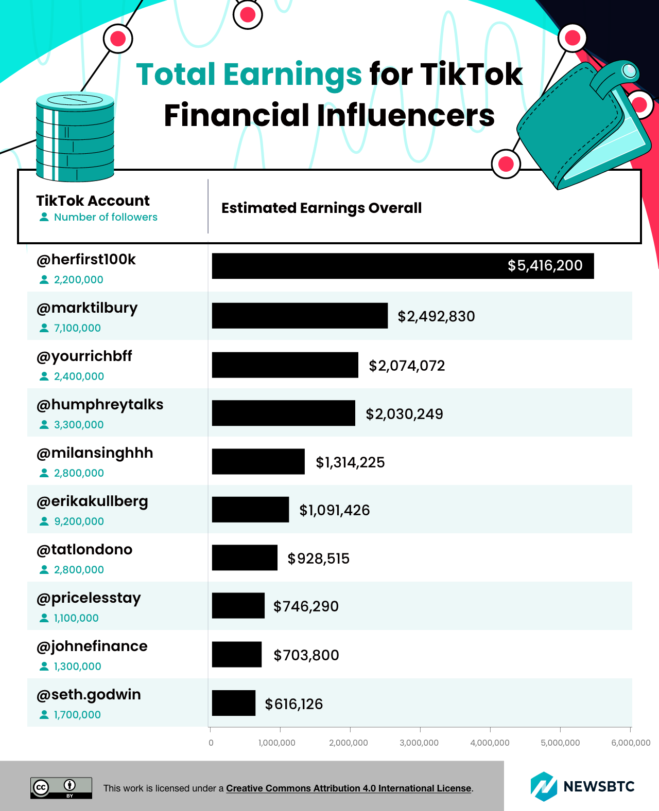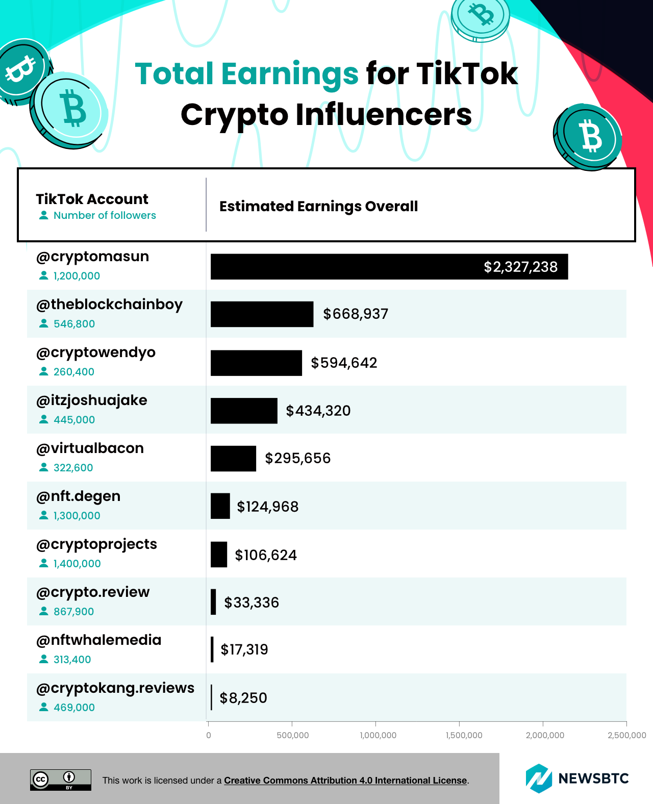 NewsBTC did this by calculating what the estimated total earnings are for top crypto and financial influencers, and dividing that by the number of months they had been active on the platform. Total earnings were calculated using the TikTok Money Calculator on Influencer Marketing Hub which takes the number of videos and engagement rate into account when providing earning estimations.