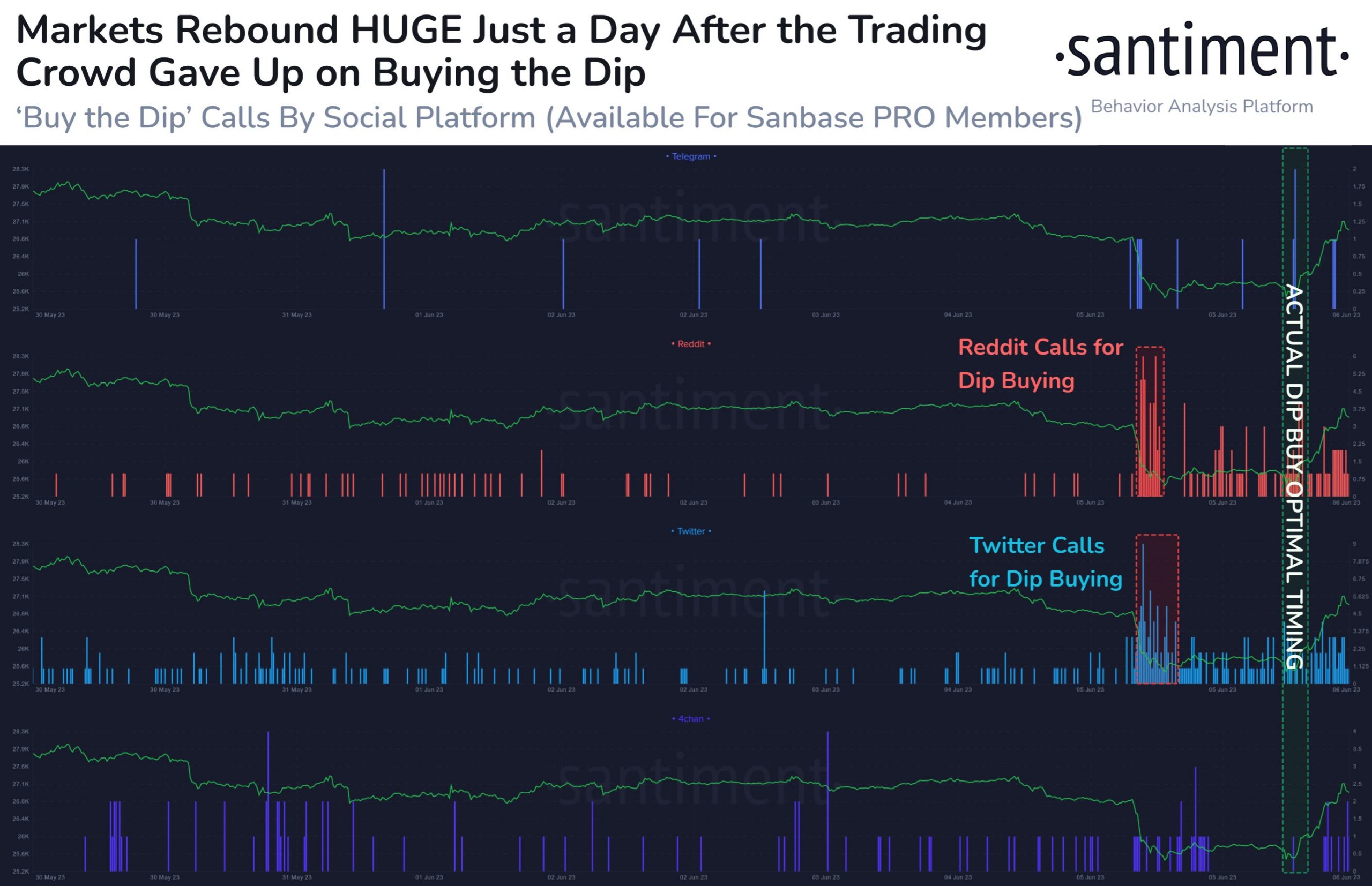 According to data from the on-chain analytics firm Santiment, calls for buying the dip had mostly disappeared right before the actual rebound. The indicator of interest here is the “social volume,” which measures the total number of social media text documents that mention a given topic or term.