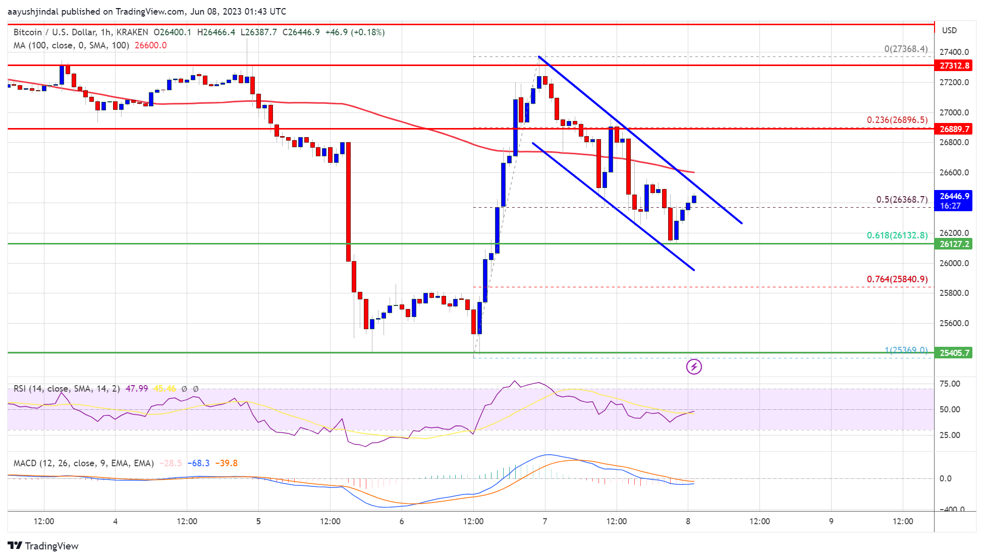 Bitcoin price is correcting lower from the $27,400 resistance. BTC could start a fresh increase if it is able to clear the $26,600 resistance zone.
