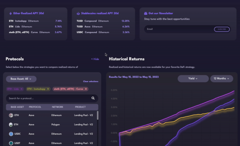 DeFi Returns brings comprehensive up-to-date information on DeFi strategies and protocols, to easily compare and analyze their performance. Getting the most reliable data source for historical yield on DeFi, to help users make informed decisions when investing in the ecosystem. All data displayed is sourced from the protocol’s smart contracts directly.