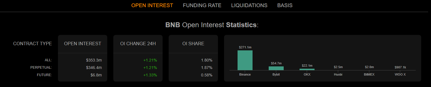 Adding to the prevailing bearish sentiment surrounding BNB, its chart analysis reveals additional causes for concern. Notably, BNB’s open interest has gained upward momentum, indicating an influx of new or additional capital entering the market.