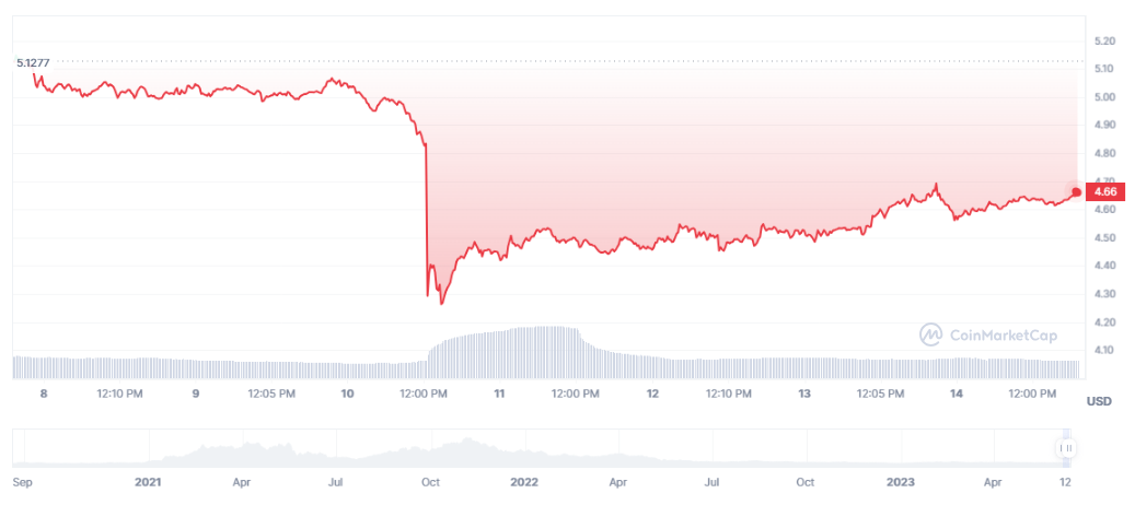 As of now, DOT continues to face a considerable setback, with a seven-day decline of 9.31%. CoinMarketCap reports DOT’s current price at $4.65. This substantial decrease in value has raised questions about the asset’s ability to regain its previous strength.