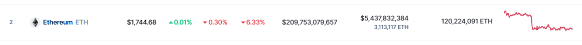 At the time of writing, Ether (ETH was trading at $1,744, down 6.33% in the last seven days, data from crypto market tracker CoinMarkeCap shows. Tether (USDT), on the other hand, is painted in red, and trading at $0.99.