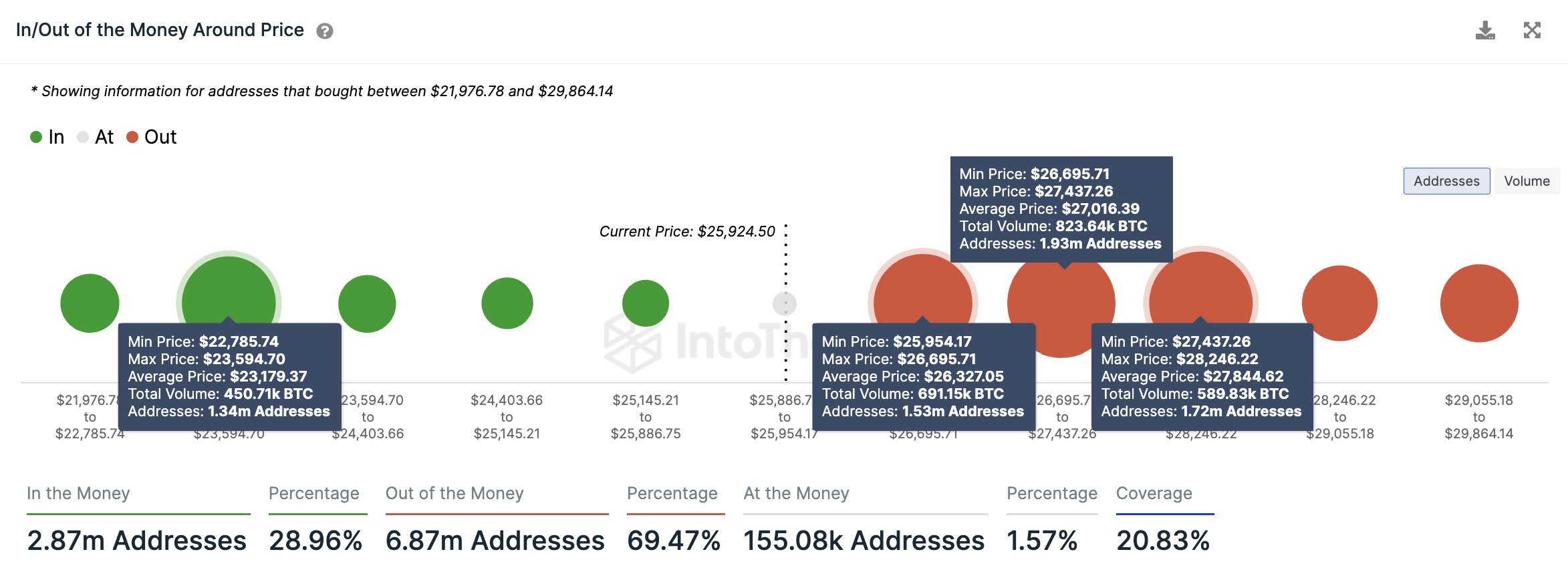 Notice the most important support zone is between $22,785 and $23,595 where 1.34 million wallets hold 450,000 $BTC. On the flip side, #BTC faces stiff resistance between $26,000 and $28,250 where 5.18 million wallets bought 2.1 million BTC.