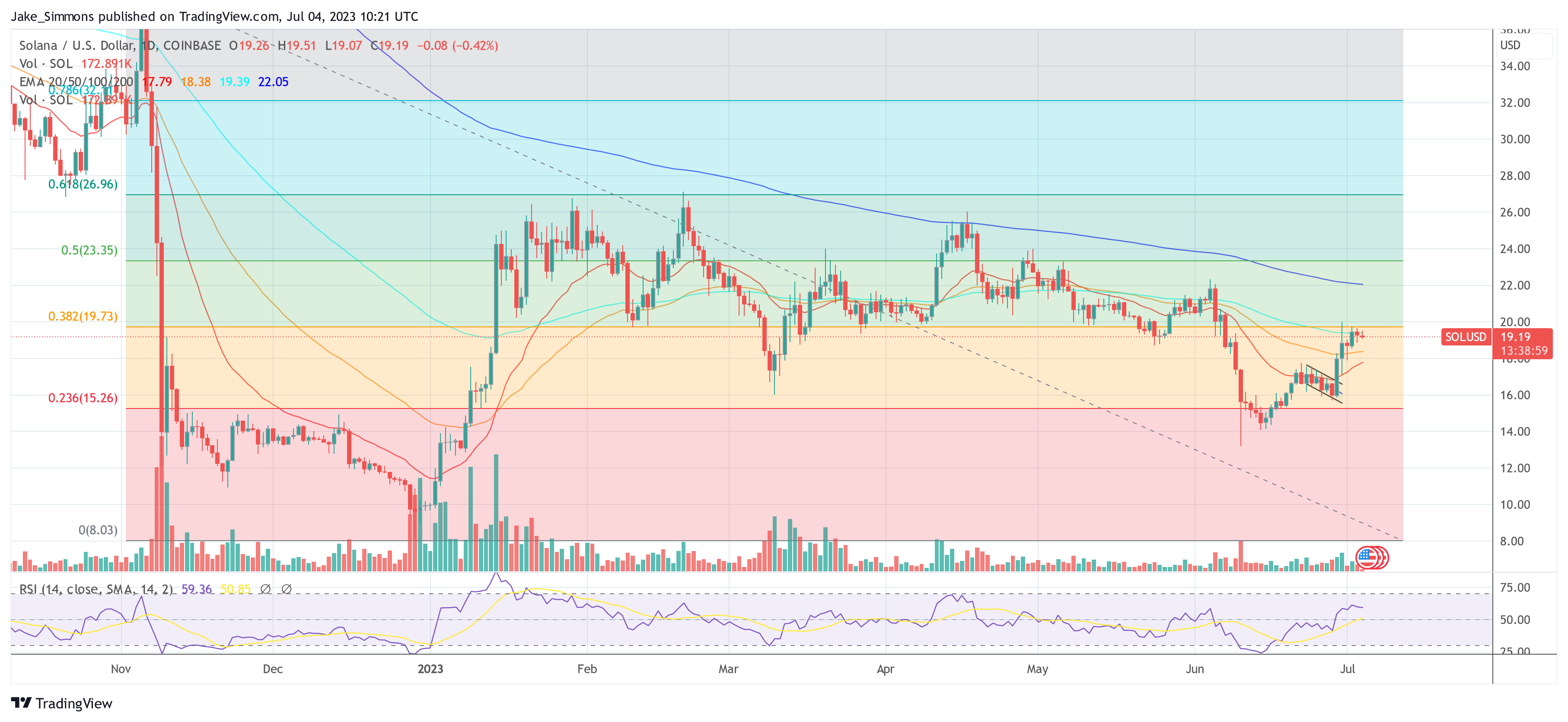 An analysis of the 1-day chart using Fibonacci retracements shows that the SOL price is at a pivotal point for the coming weeks. At the time of writing, SOL was trading at $19.19, just below the 38.2% Fibonacci retracement level. So far, SOL bulls have failed to break above this level at $19.72.