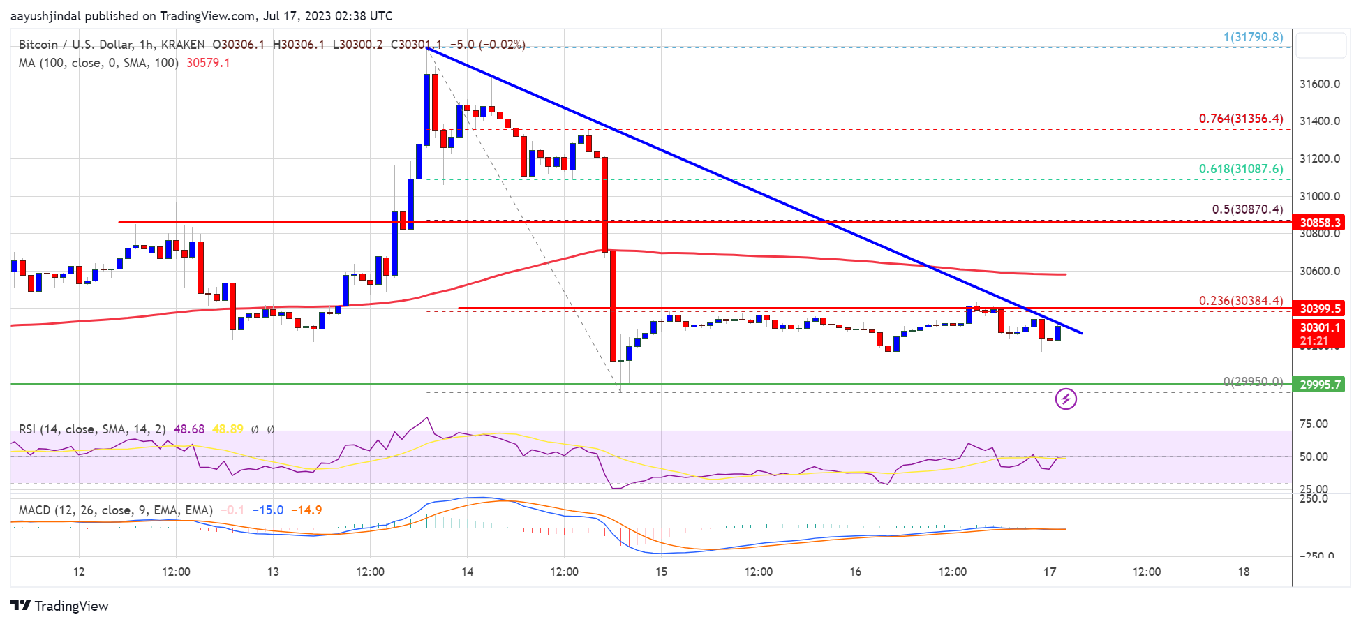 A high was formed near $31,790 before there was a sharp decline. There was a move below the $31,000 and $30,400 levels. The price even spiked below $30,000. A low is formed near $29,950 and the price is now consolidating losses.