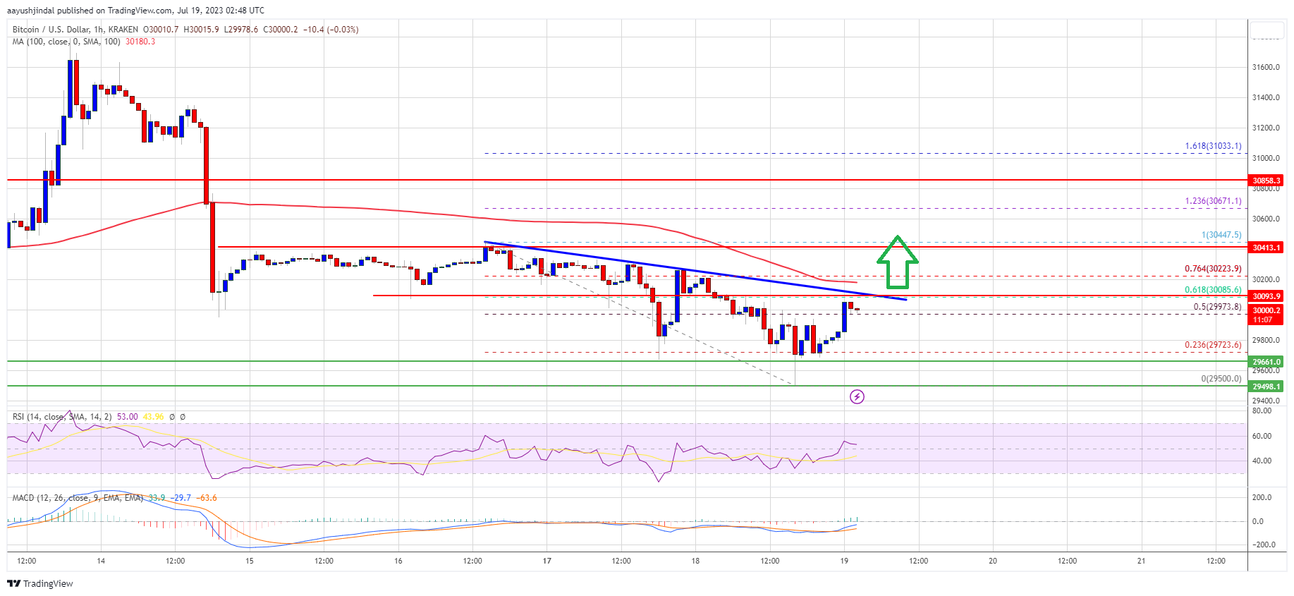 Bitcoin price followed a bearish path below the $30,200 pivot level. BTC even broke the $29,850 level and tested the $29,500 level. A low is formed near $29,500 and the price is now attempting a fresh increase.