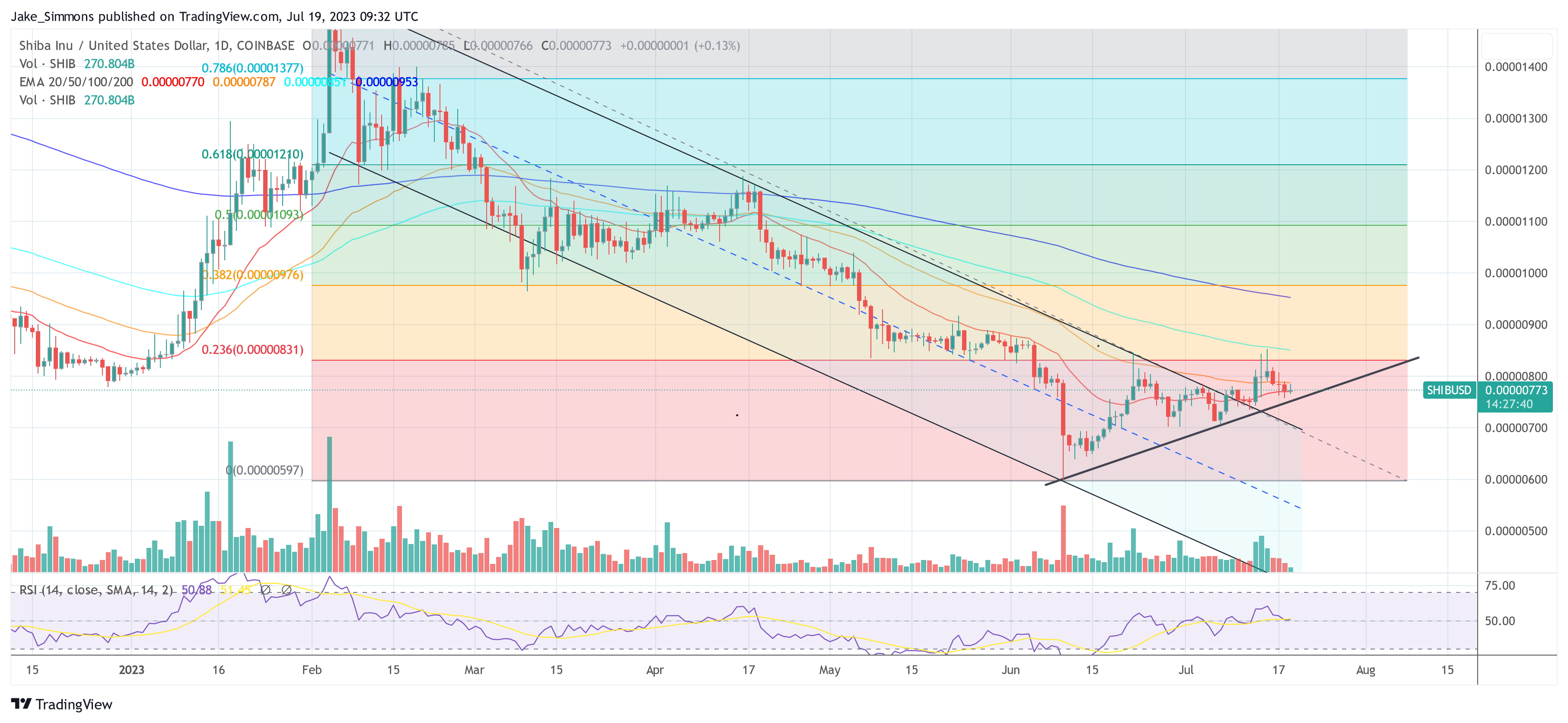 A new bounce towards the 23.6% Fibonacci retracement level could be possible. So far, SHIB has failed to close above the $0.00000832 resistance on a daily basis in three attempts. But, as explained at the beginning, a decision could be forthcoming by the end of the month.