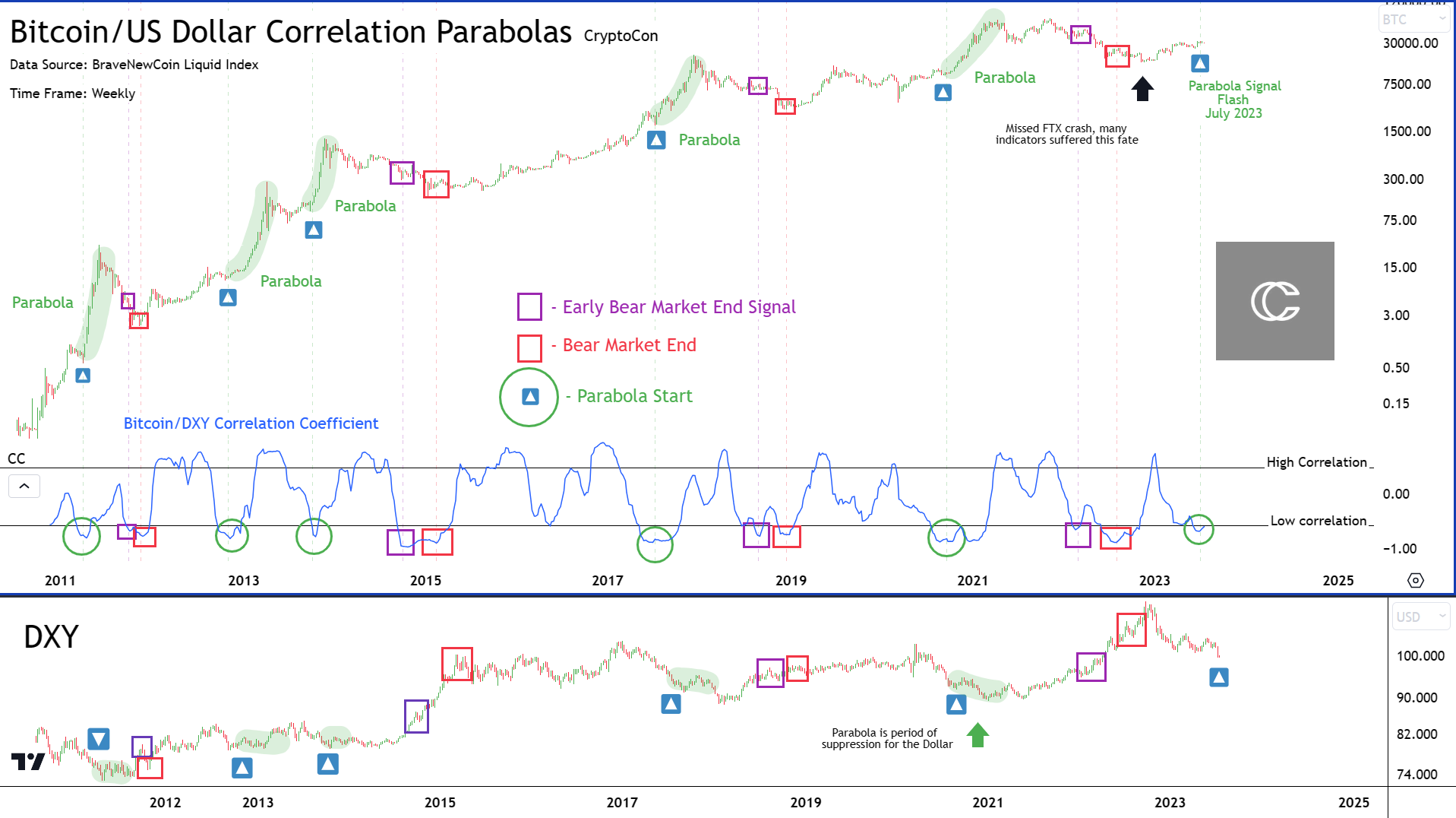 In a recent newsletter by renowned analyst CryptoCon, a groundbreaking indicator known as the “Bitcoin DXY correlation coefficient” has captured the attention of the community. This indicator, which measures the correlation between Bitcoin and the U.S. Dollar Index (DXY), has shown remarkable accuracy in predicting Bitcoin’s price movements and signaling the beginning of bull market parabolas.