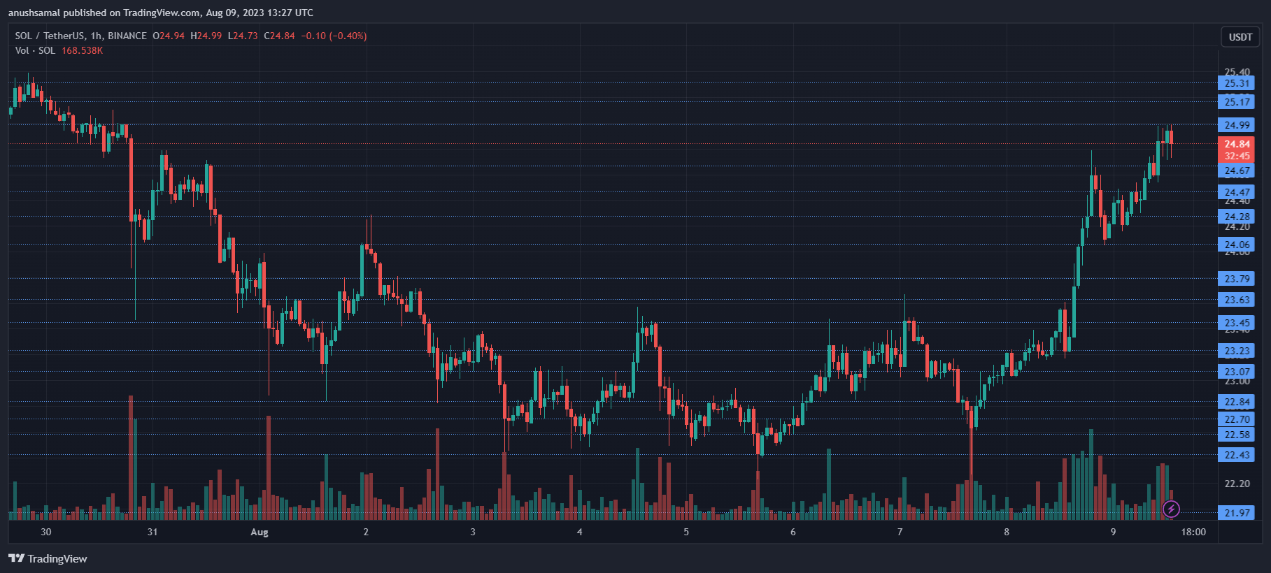 The Solana price exhibited a bullish trend during the recent trading session, pushing it beyond the $24 mark. It surpassed a key resistance hindering its progress for over a week. Within the last 24 hours, SOL saw a rise of around 6%, with a similar price increase visible on the weekly chart.
