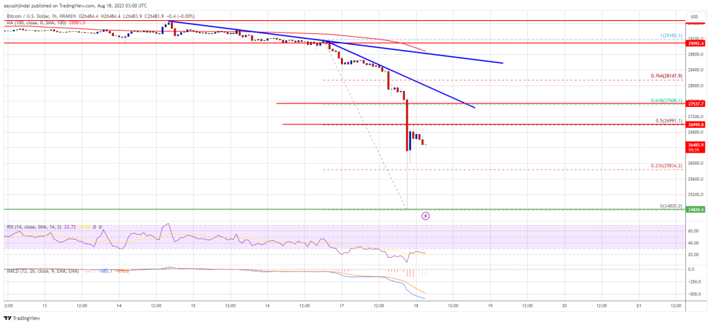 Bitcoin price tumbled below the $28,400 support. BTC tested $24,800 and is currently attempting a recovery wave toward $27,000.