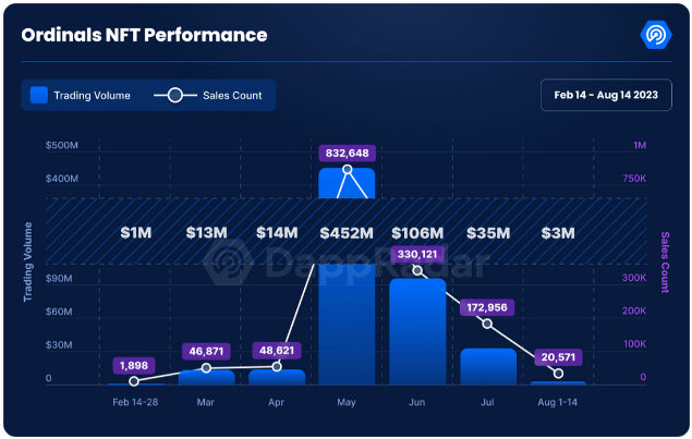 According to a recent report from DappRadar, the fervor that propelled Bitcoin Ordinals to record-breaking heights earlier this year has dwindled, with sales volume plummeting by over 97% from its peak in May 2023.