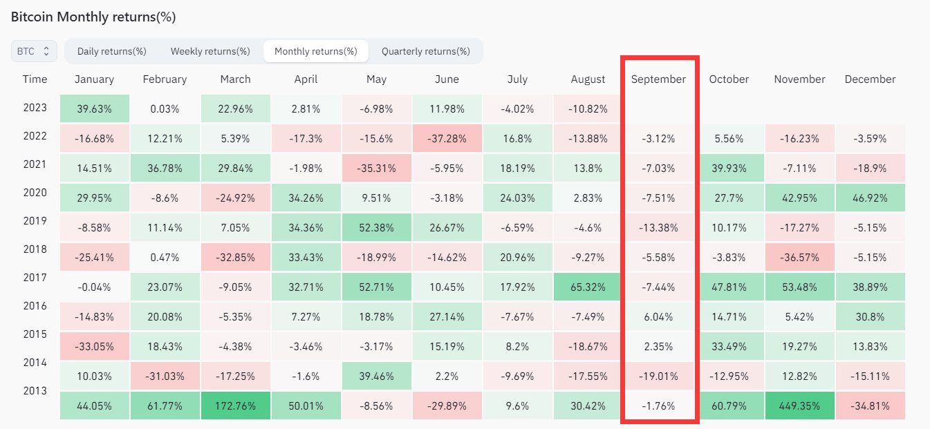 Examining the chart above, it becomes evident that September has historically been a challenging period for Bitcoin.