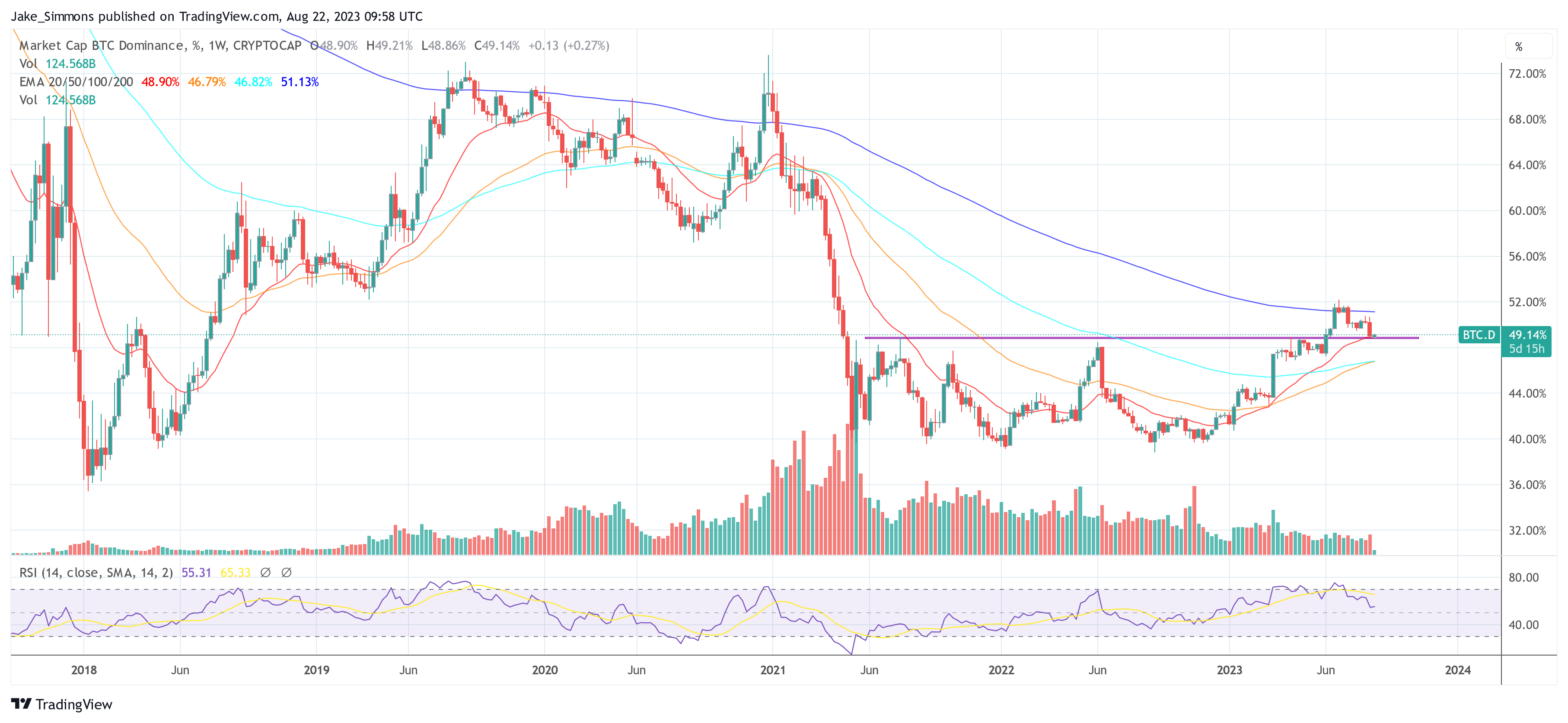 Market observers are closely eyeing the tussle between Bitcoin and its altcoin counterparts. Bitcoin’s dominance, a critical indicator of its market influence relative to the entire crypto market, has reached a pivotal crossroads. This juncture holds the potential to determine whether this year’s trend of Bitcoin outperforming altcoins will persist or if the heralded “altcoin season” is on the horizon.