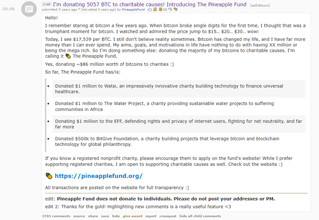 So a Redditor that made boatload of money being a very early investor/miner realized he/she had more than they actually need, so they decided: Hey I'm gonna donate a good portion of it to charity and to people in need. This is their original post that they posted almost 6 years ago Original post of theirs on Reddit Fund through which they would donate the funds to other charities was called PineappleFund, and in the end they donated around 5104 Bitcoins to more than 50 different charities. Bitcoin worth of the originally donated amount of 5057 Bitcoins was worth around $85 million at the time, and later on they donated another 47 Bitcoins in 2018. Donations were of course in fiat. Bitcoins was sold to fiat currency (USD) and donated directly to some of the popular or less known charities. Charities included $5 million to GiveDirectly, $5 million to Open Medicine Foundation, $1 million donated to Water Project, $1 million to EFF, some went to smaller charities suggested by Redditors in original and other threads etc… They also made applications for charities on their website to apply for a possible donation, and according to the owner of the website and Pineapple Fund, more than 10,000 applications were made and in the end around 60 charities ended up being donated to. One of their last comments on their Reddit account that was made 2 years ago, implied there might be Pineapple Fund V2 which would be amazing thing to happen again even if funding would be quite lower this time. Maybe this person is waiting for another bullrun to trigger another round of charity funding when BTC prices stand higher. submitted by /u/mbdtf95 |