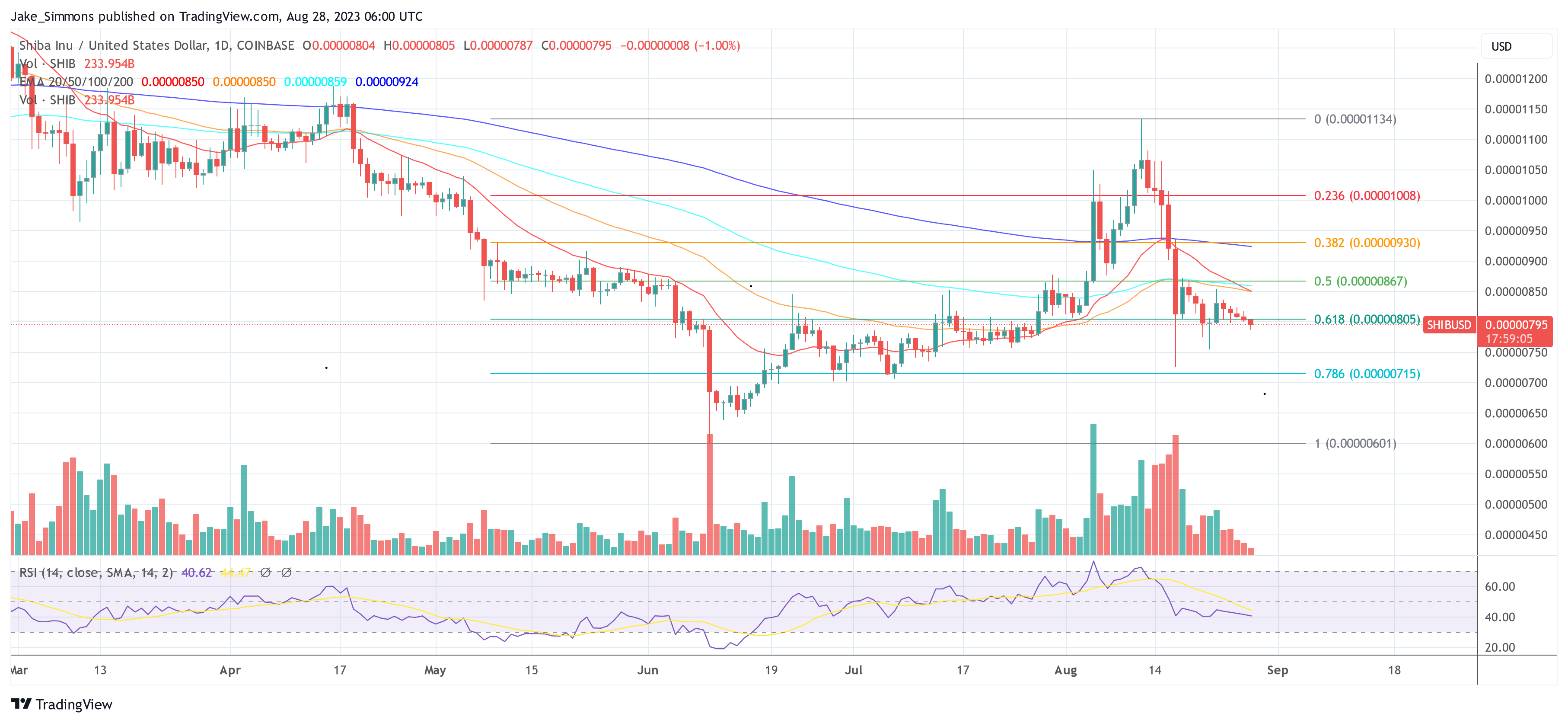 The Shiba Inu token (SHIB) has been on a rollercoaster ride, especially in the wake of Shibarium’s initial troubled launch. After reaching a 4-month high of $0.00001134 on August 12, the token’s price plummeted. Currently, SHIB is trading below all major daily moving averages, with the 50-day EMA acting as a formidable resistance level.
