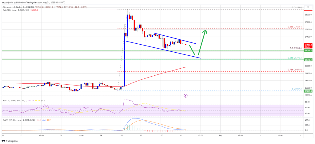 A high was formed near $28,150 and the price started a downside correction. There was a move below the $28,000 and $27,500 levels. The price even spiked below the $27,400 level. However, it found support near the 50% Fib retracement level of the key increase from the $25,928 swing low to the $28,150 high.