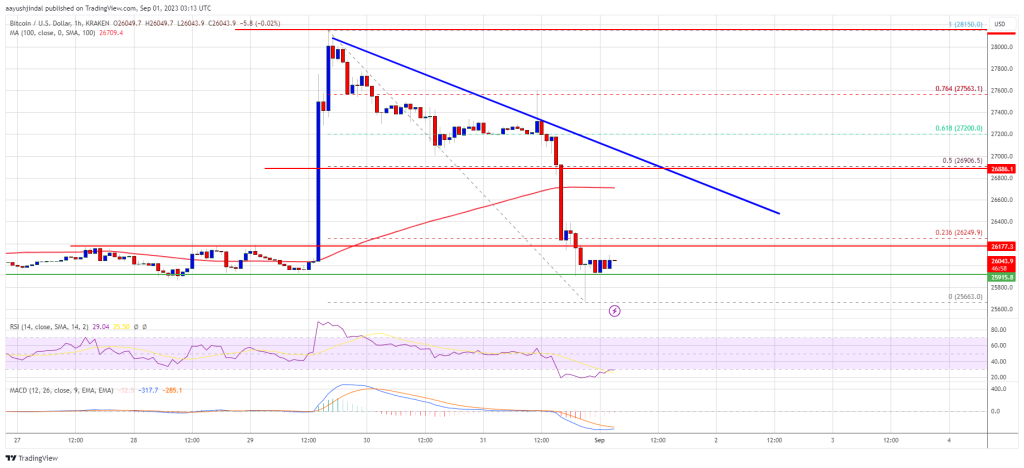 There was a clear move below the $26,200 level. The price even spiked below the $26,000 level. A low is formed near $25,663 and the price is now consolidating losses. Bitcoin is now trading below $26,600 and the 100 hourly Simple moving average.