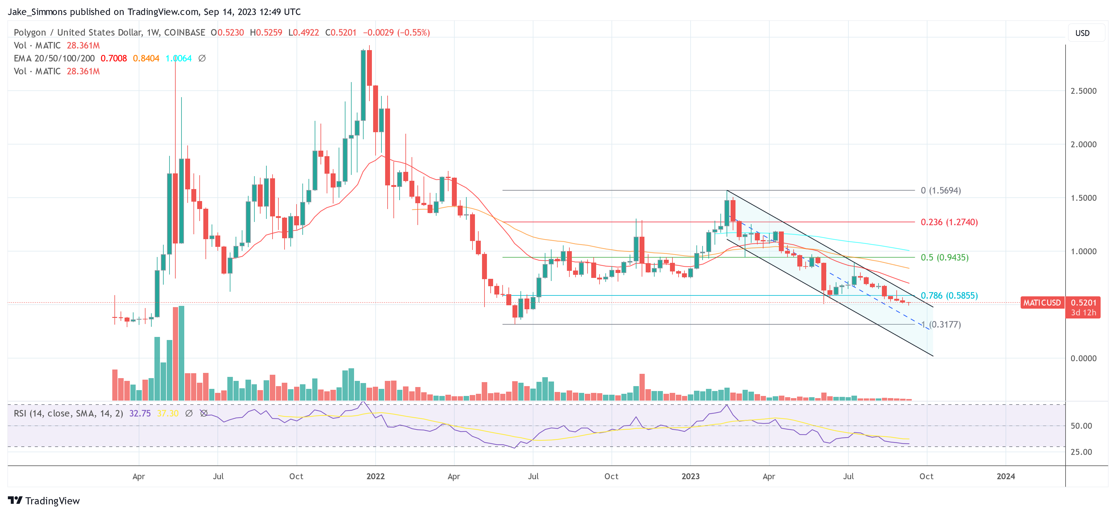 The MATIC price currently remains in a downtrend channel that saw its beginning in mid-February this year. MATIC hit its yearly high of $1.56 on February 13 and has fallen 68% since then. However, a look at the 1-week chart shows that there is hope for MATIC bulls.