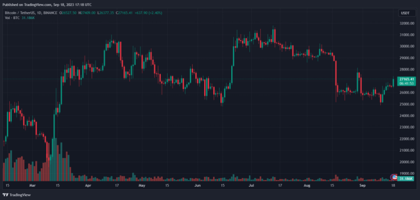 As of this writing, the Bitcoin price trades at $27,200 with a 3% profit in the last 24 hours. Over the previous week, the cryptocurrency experienced a 9% gain, with the rest of the top 10 by market cap displaying similar price action but lagging BTC.
