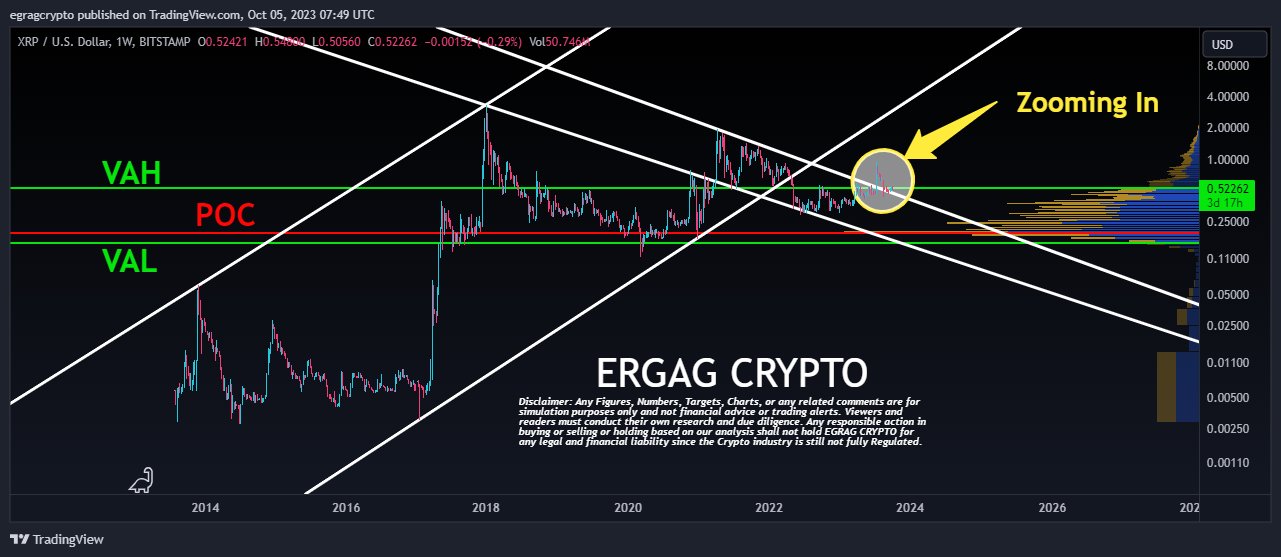 Egrag’s second chart reinforces this VPVR analysis. If bulls can conquer the $0.55 resistance, Egrag projects an XRP rally towards the $1 mark, a level last touched in mid-June post the Ripple summary judgment in the case against the SEC.