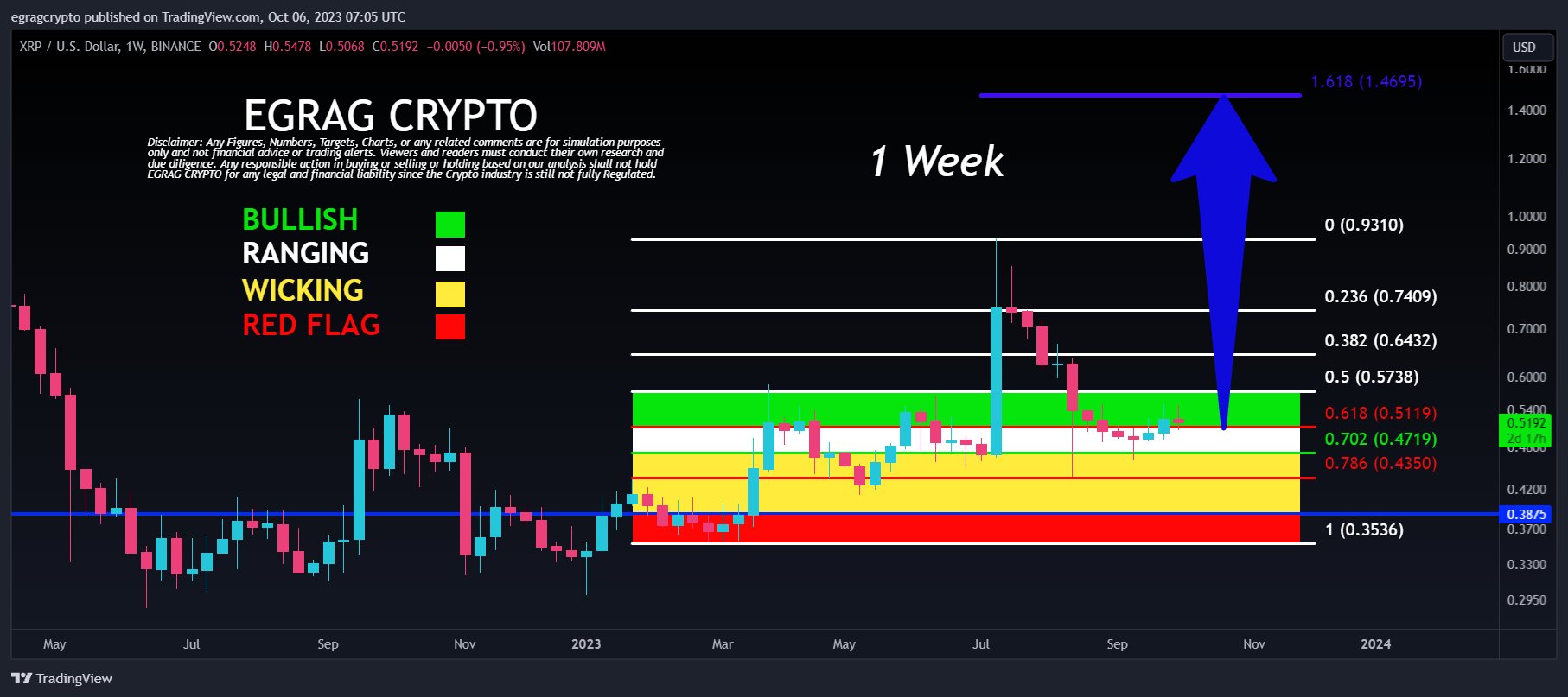 Delving into the Weekly Chart, Egrag finds an evident optimistic momentum. XRP is on the brink of achieving a notable milestone: sealing a full-body candle beyond the Fib 0.618 retracement level at $0.5119. Egrag notes that the imminent week’s closure and the definitive form of the candle would serve as a robust affirmation of this trend.