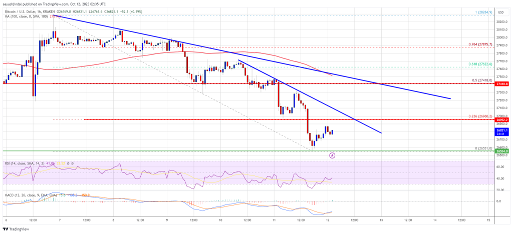 There was a drop below the $26,800 level and the price tested the $26,500 support. A low is formed near $26,551 and the price is again attempting a recovery wave. There was a minor increase above the $26,800 level. However, the price is still facing many hurdles.