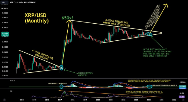 JD shared an accompanying chart to elucidate his point. From the chart, one could see that XRP enjoyed a 650x gain the last time the MACD crossed 0. This significant breakout, which came in 2017, happened after a 4-year trendline that dated back to 2014.