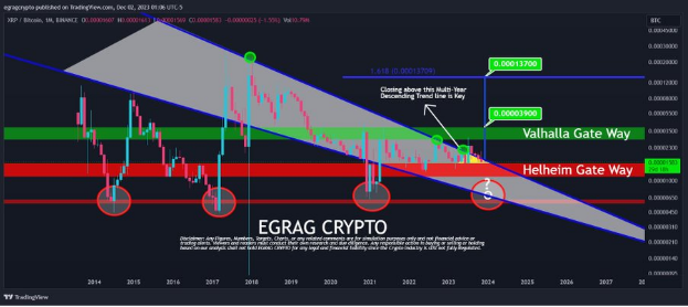 Crypto analyst Egrag Crypto has also given his view on the future trajectory of XRP in relation to Bitcoin. He spoke about a “Helheim Gate Way” scenario and how Bitcoin’s price could affect XRP’s. He said BTC surging to the 48k-50k range might exert pressure on XRP, causing it to decline against the flagship cryptocurrency.