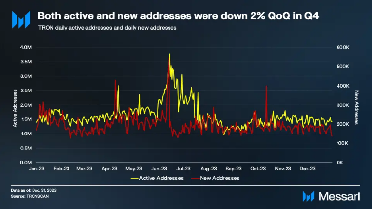 The Q4 report from Tron reveals a significant contrast between its thriving DeFi sector and subdued core network activity. Despite a remarkable 41% increase in Total Value Locked (TVL) in Tron’s DeFi space, securing the second position after Ethereum, the network experienced a slowdown in user growth.