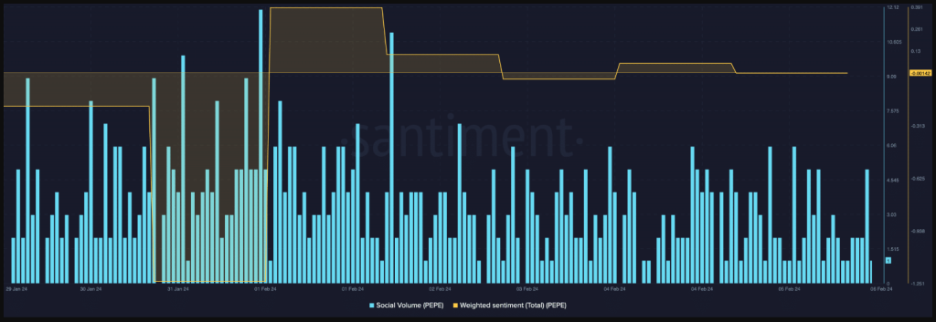 Sentiment around Pepe took an interesting turn, defying the price decline. The meme coin’s Weighted Sentiment, tracked since February 1st, witnessed a rise, indicating growing optimism within the community. This positive buzz was further fueled by consistent social media engagement, reflected in high Pepe Volume throughout the week.
