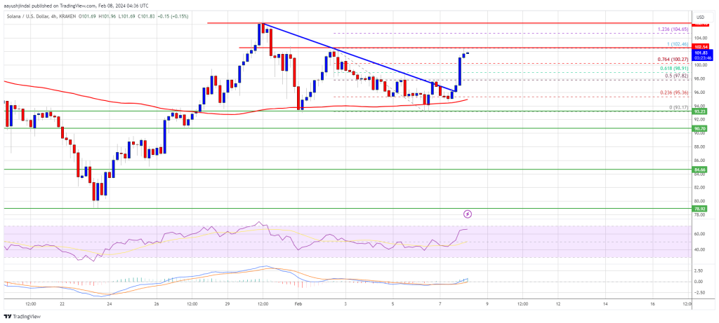 Besides, there was a break above a major bearish trend line with resistance at $96 on the 4-hour chart of the SOL/USD pair. Solana is now trading above $98 and the 100 simple moving average (4 hours).