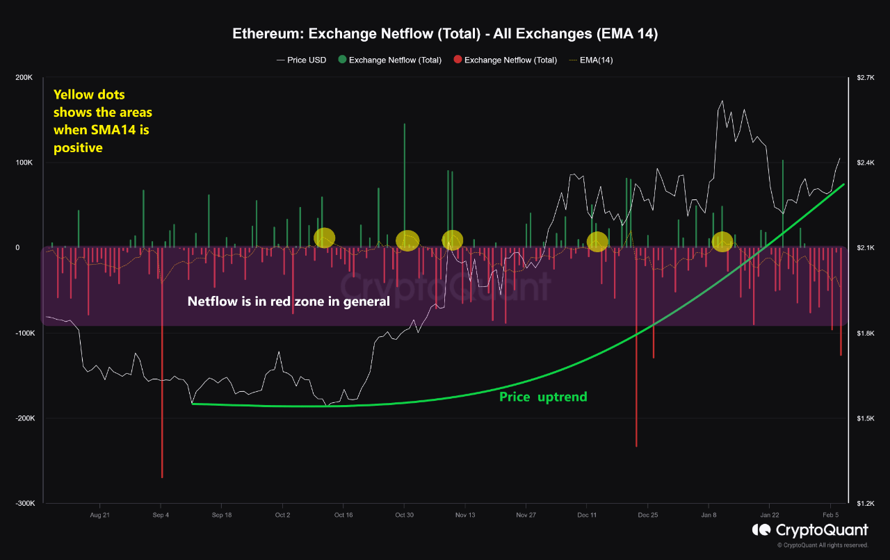 Now, here is a chart that shows the trend in the Ethereum exchange netflow, as well as its 14-day exponential moving average (EMA), over the last few months: