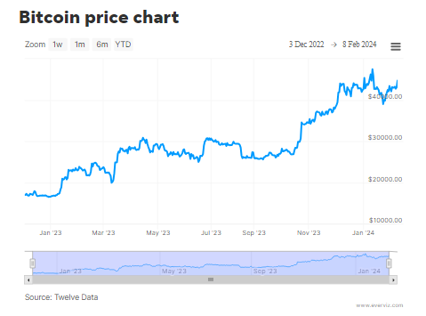 Despite the approval of several eagerly awaited exchange-traded funds that were meant to strengthen its institutional legitimacy, Bitcoin’s 2024 has had a rough start. However, things are improving as Bitcoin is now again trading above the $46k territory.