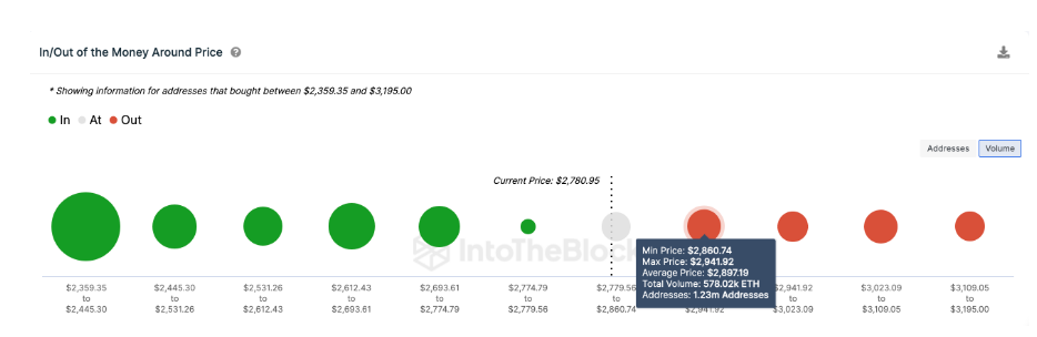 IntoTheBlock’s global in/out of the money (GIOM) data further emphasizes this point. This data groups all existing ETH holders based on their historical buy-in prices. According to GIOM, the cluster of holders at the $2,850 resistance level represents a potential selling pressure. However, if the bulls can overcome this hurdle, another leg-up towards $3,000 and beyond becomes more likely.