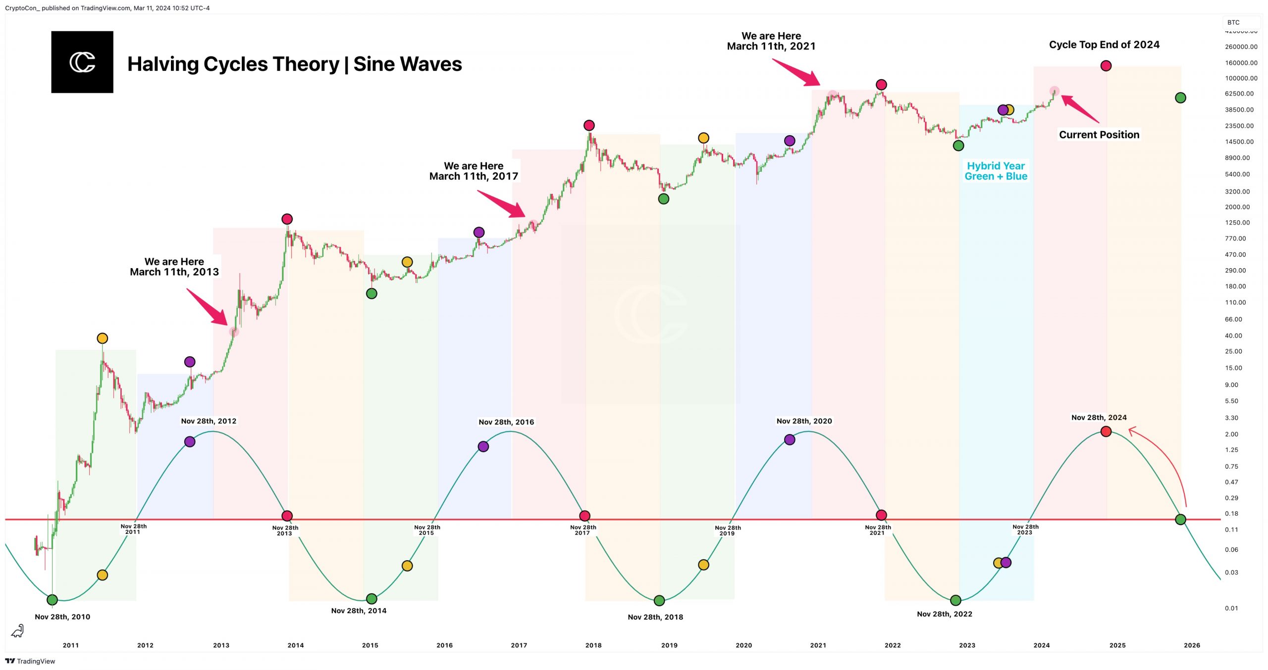 Similar to Rekt’s analysis, market expert Crypto Con suggests that the “conventional four-year cycle” may no longer hold, as Bitcoin is reaching new all-time highs sooner than expected, and as such, Crypto Con believes that the “boundaries of the traditional cycle” are being pushed, potentially signaling a paradigm shift in Bitcoin’s market dynamics.