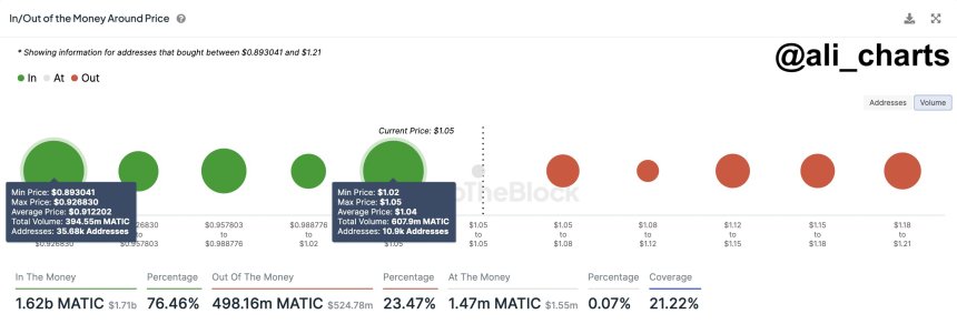 Most notably, over 10,900 wallet addresses bought a whopping 608 million MATIC around the $1.02 and $1.05 zone. According to the crypto analyst, this massive buying activity has supported the establishment of crucial support around this price region.