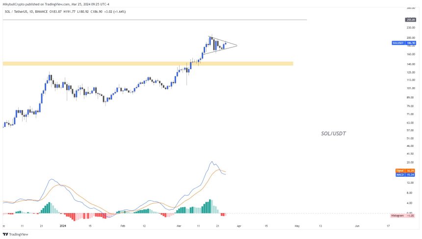 Similarly, another analyst using the pseudonym Mikybull points out that SOL is currently consolidating within a symmetrical triangle pattern on a daily timeframe.