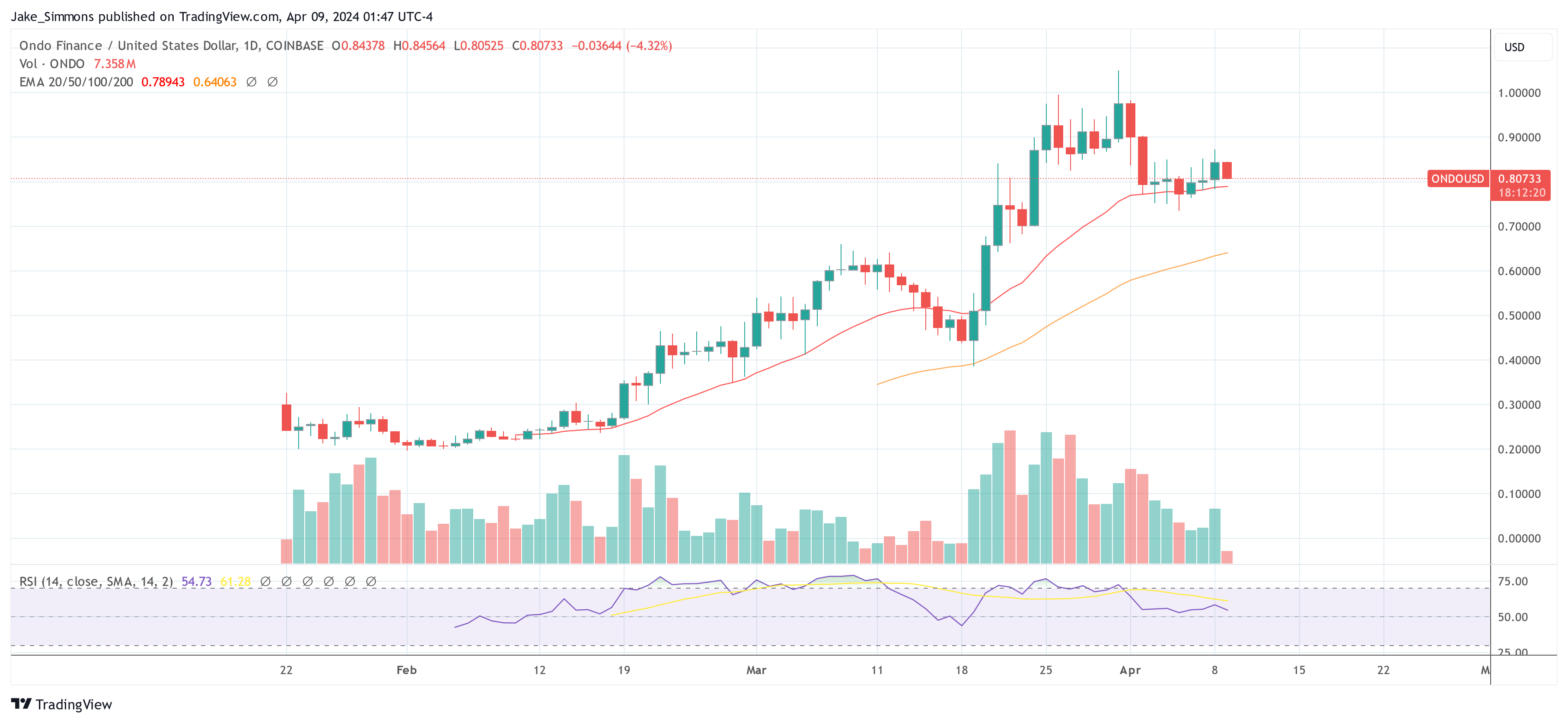 At press time, ONDO had a market capitalization of $1.12 billion and was the 94th largest cryptocurrency by market cap. The price stood at $0.80.