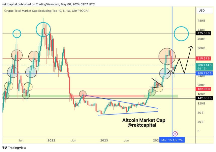 According to analyst and trader Rekt Capital, the Altcoin market cap, excluding the top 10 cryptocurrencies, has “successfully retested the $250 billion level as a support level” over the last several weeks.