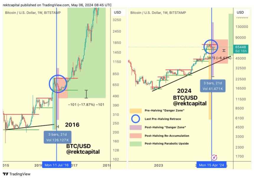 He stated that Bitcoin saw its first pre-Halving retrace of -18% about 30 days before the Halving, while in 2016, the pre-Halving retrace started 28 days before the event, suggesting BTC could move in the same direction as that of 2016. Due to this, Rekt Capital is confident that a potential danger zone could occur after Halving.
