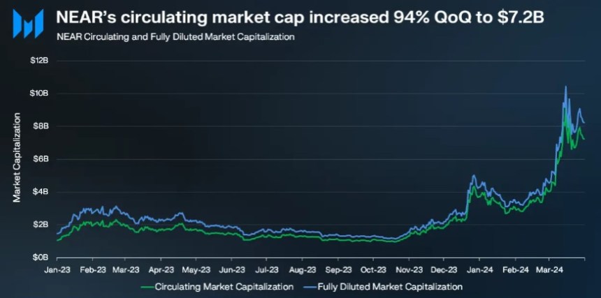 In Q1 2024, NEAR’s circulating market cap surged to $7.2 billion, marking a 94% quarter-on-quarter (QoQ) increase. The fully diluted market cap also witnessed substantial growth, reaching $8.2 billion, representing a 91% QoQ increase. These numbers propelled NEAR to secure a spot among the top 20 cryptocurrencies by market capitalization.