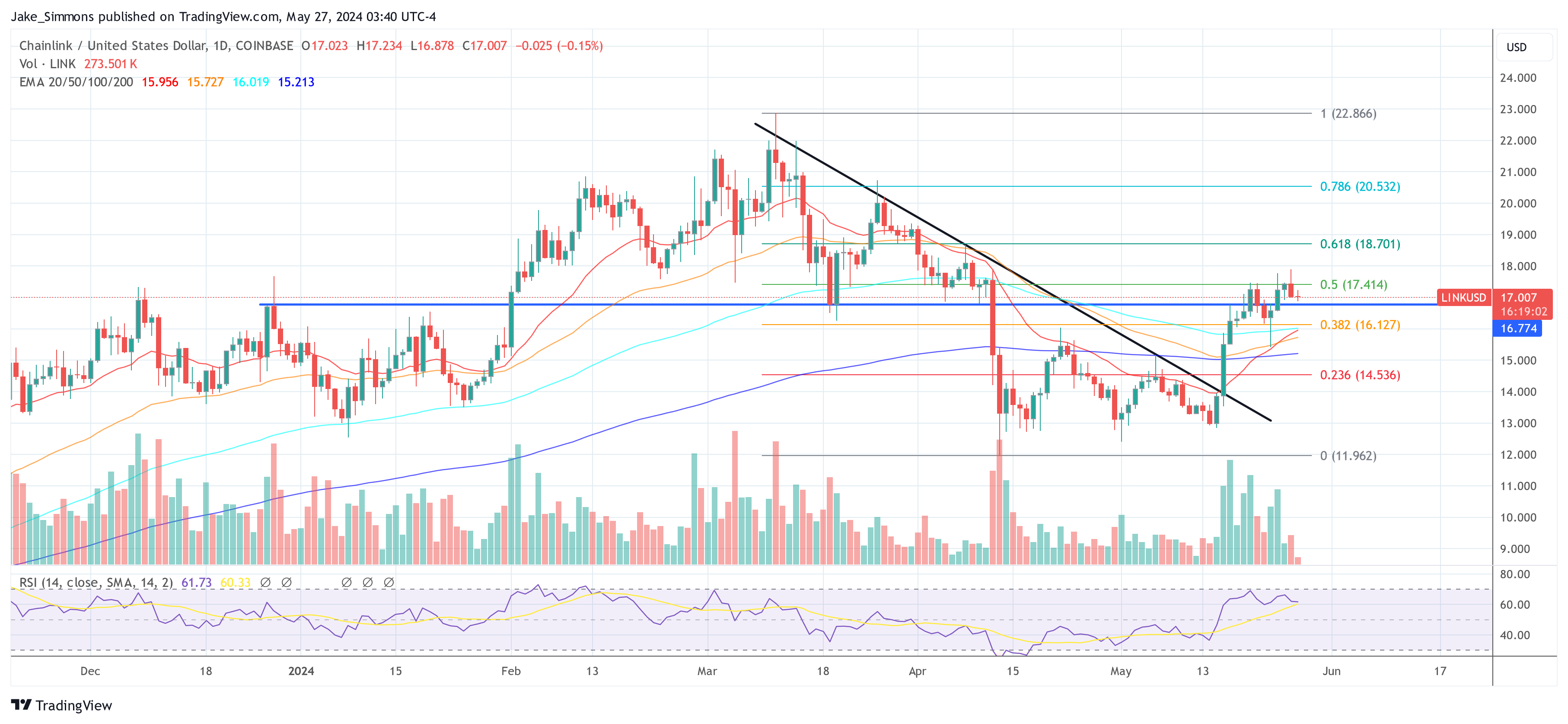 Following this pivotal breakout, LINK’s price trajectory shifted as it began a rally towards higher price levels. Notably, the price rallied to the 0.5 Fibonacci retracement level, which is calculated from the local high in early March to the significant low in mid-April. This level, sitting at approximately $17.41, has become a crucial focal point for both traders and analysts.