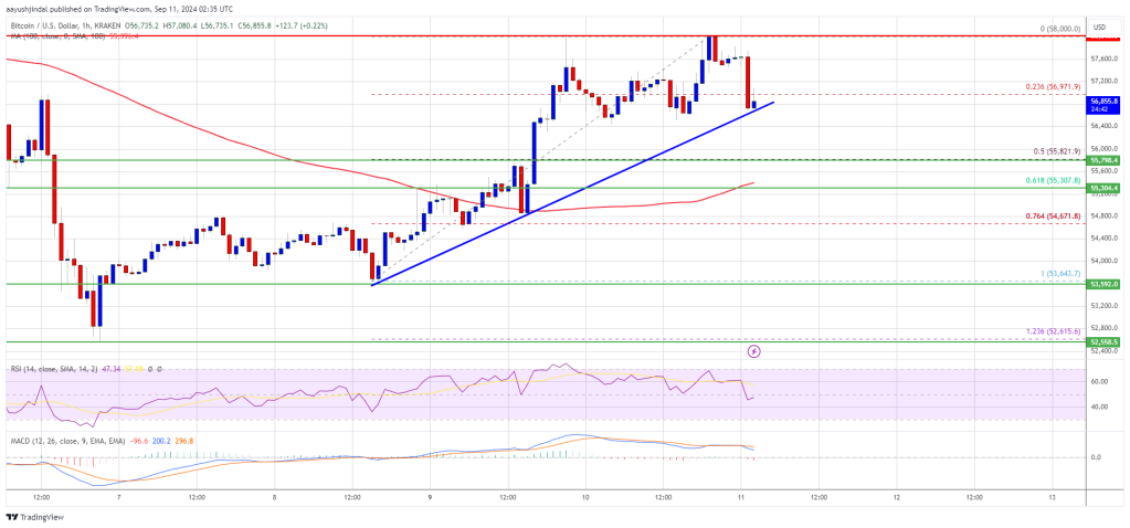 Bitcoin price started a decent increase above the $56,500 resistance. BTC is now struggling to clear the $58,000 resistance and is consolidating gains.