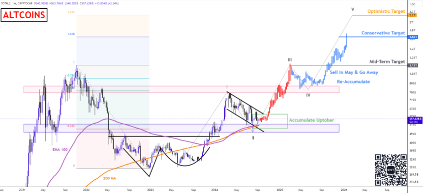 To the trader, if this scenario plays out, alts target a $2.14 trillion market cap by 2025. As of this writing, altcoins sit at a market cap of $558 billion, a 10% decrease since Q3 began.