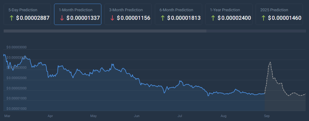 Shiba Inu’s price projection by CoinCodex appears somewhat different for the near future despite such a bold projection. By October 13, 2024 their forecast shows a rise of 5.68%, pushing its price up $0.00001337.