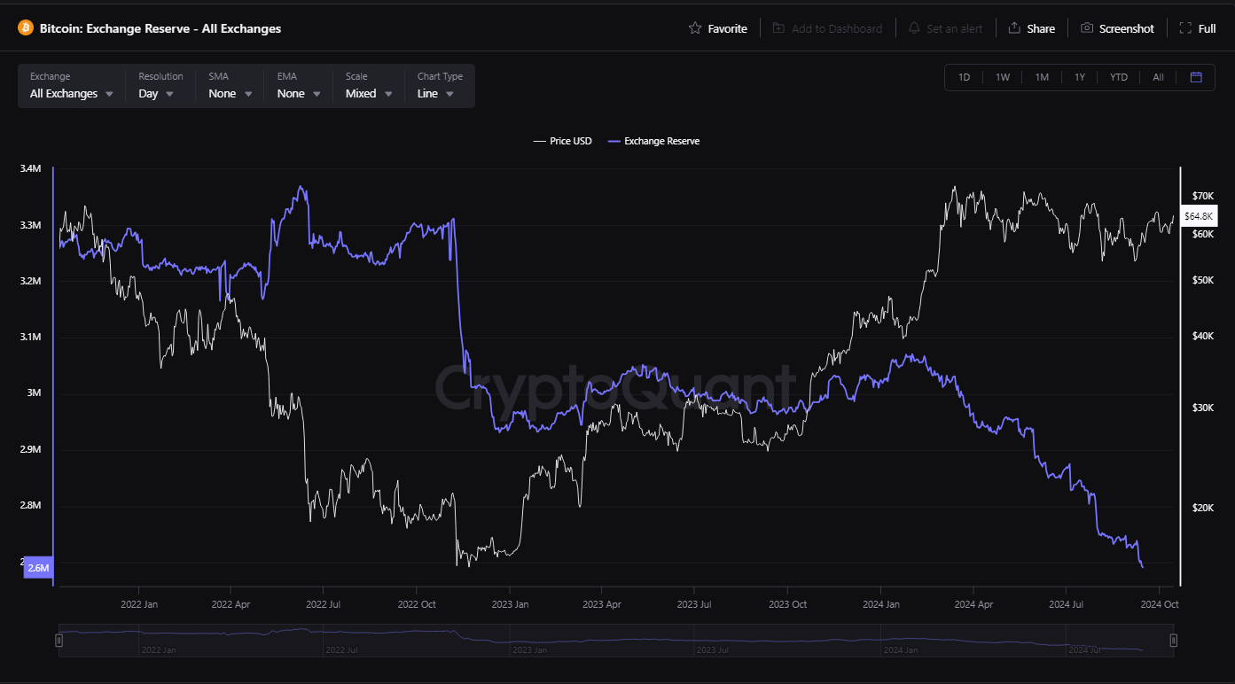 Bitcoin and Ethereum on centralized reserves took a nosedive and hit a historic low early this month. As of October 13, CryptoQuant’s chart showed that centralized exchanges for BTC recorded an all-time low of 2,666,717 bitcoins.