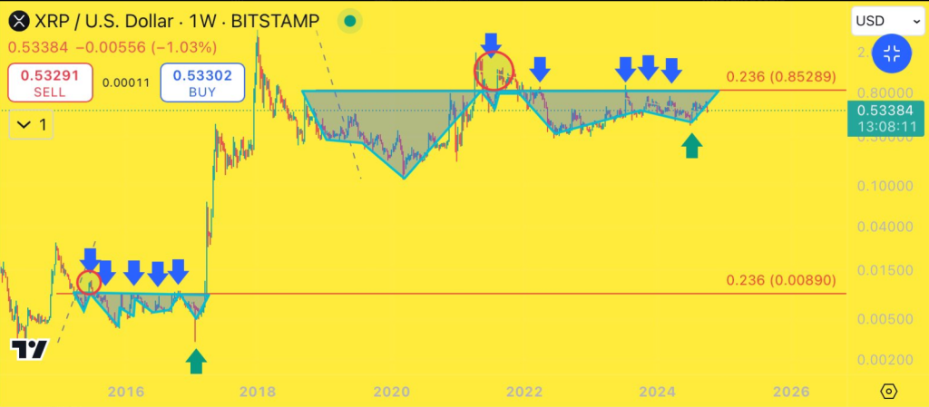 Market analyst “Random Crypto Pal” thinks XRP is about to break out in an “explosive” manner. On social media, he shares his observation and emphasized the significance of the 0.236 Fibonacci level, which XRP has not yet hit but is approaching. Should this level give way, he expects a price explosion similar to the one it observed in 2017.